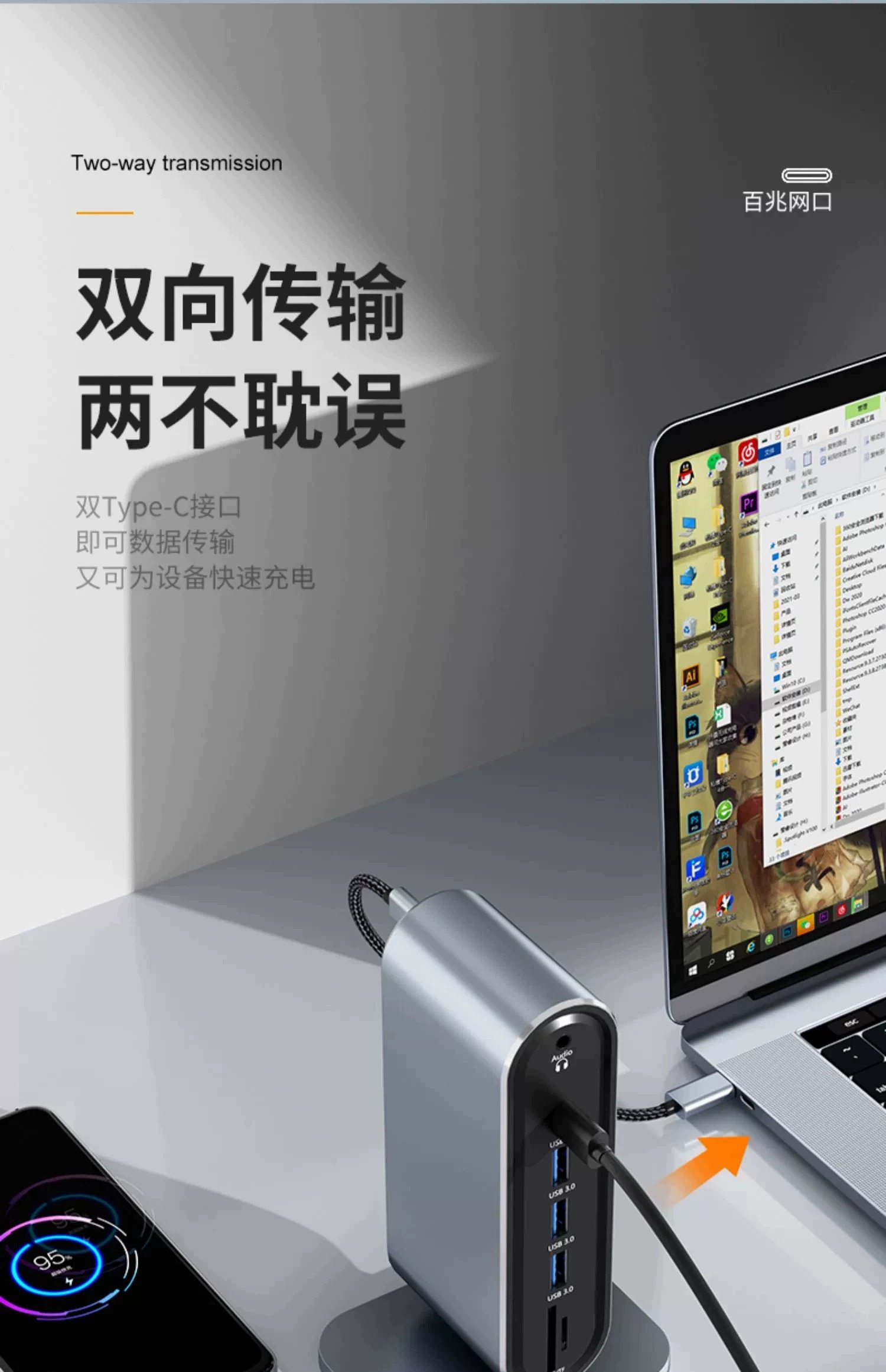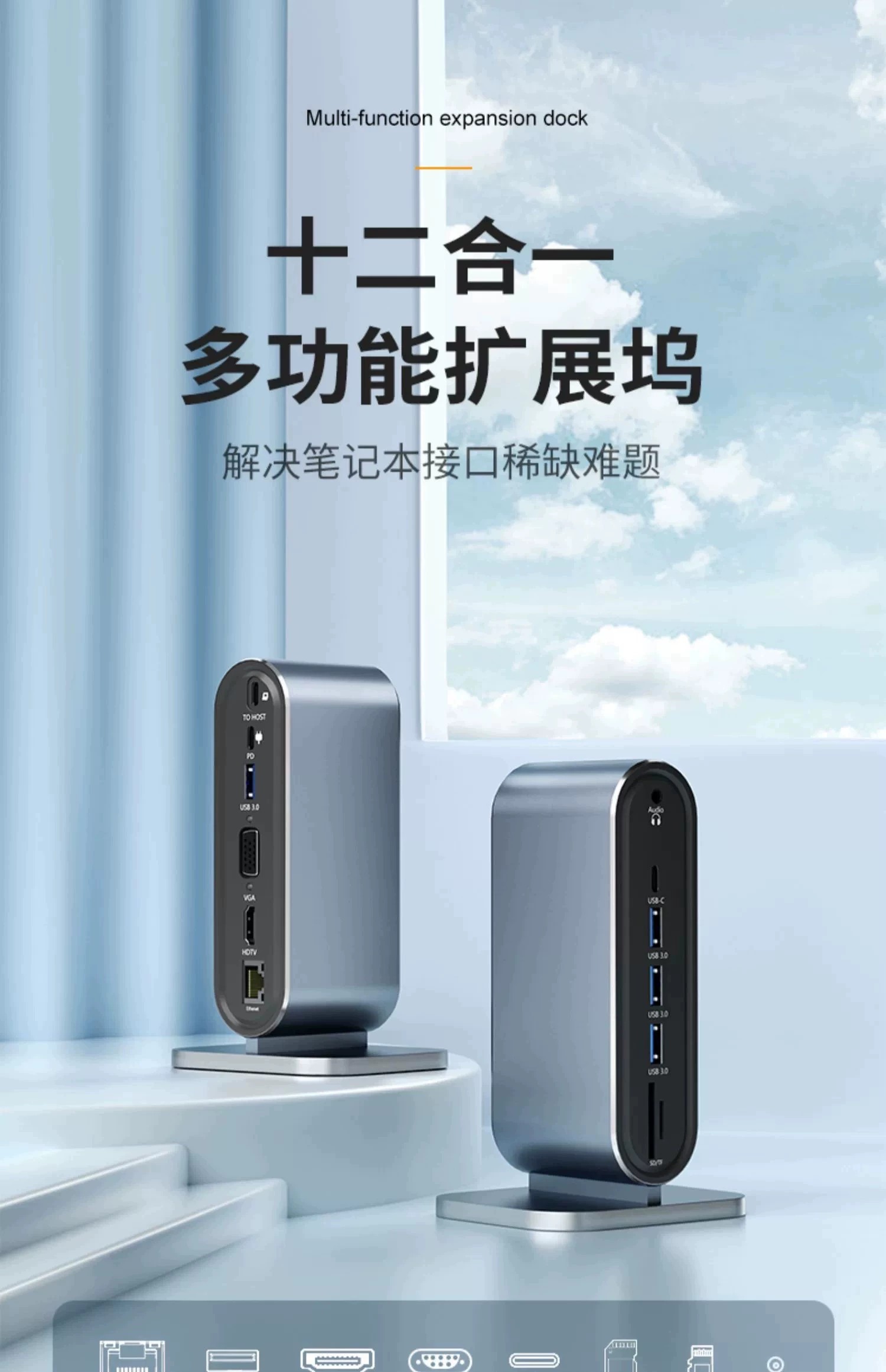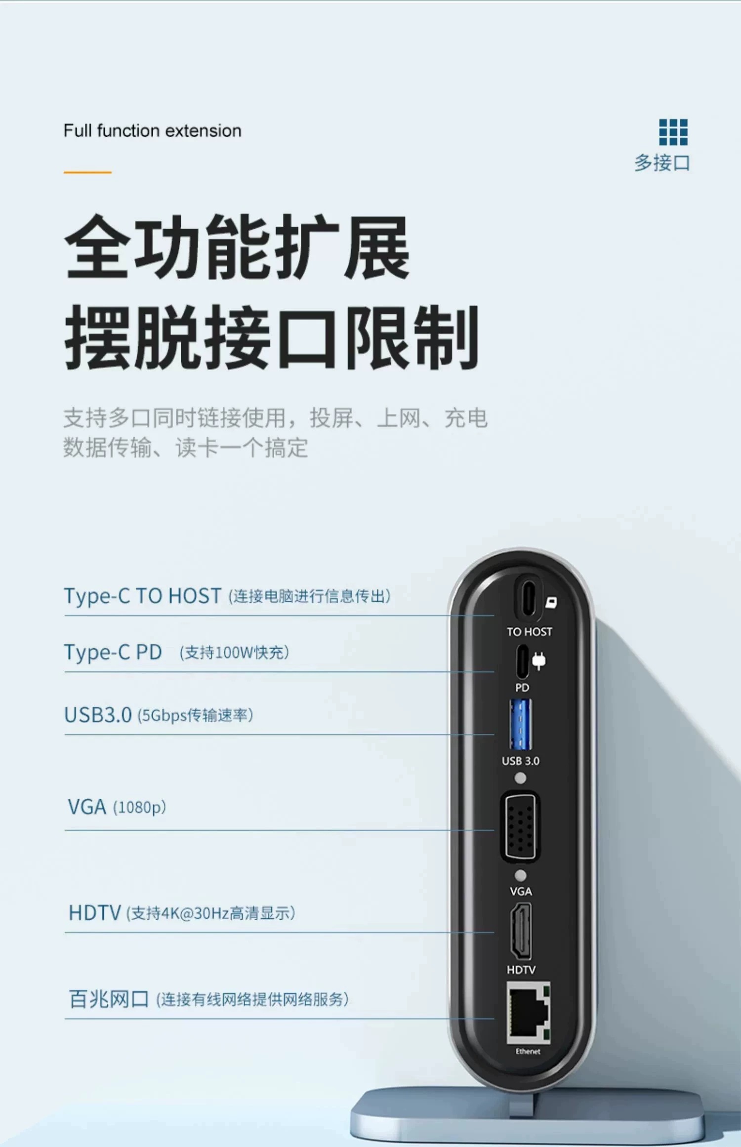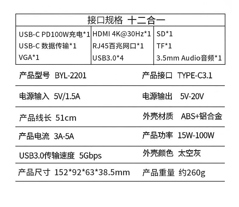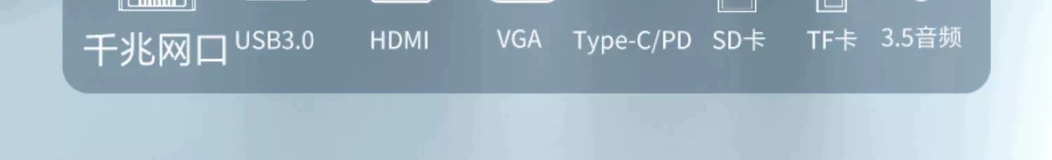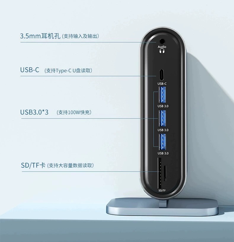 双屏同显【12合1】百兆网口+HDTV++VGA+PD快充+SD/TF+USB3.0*1+耳机孔