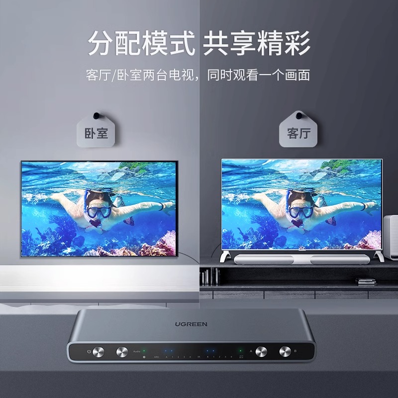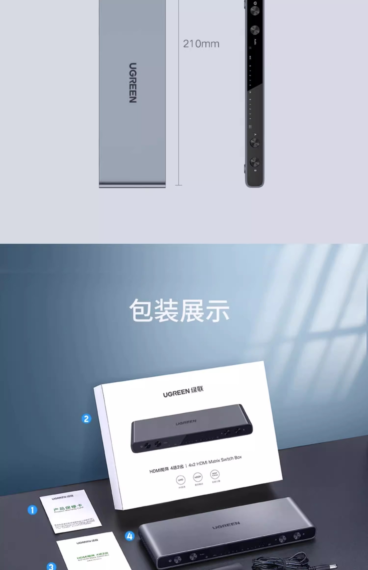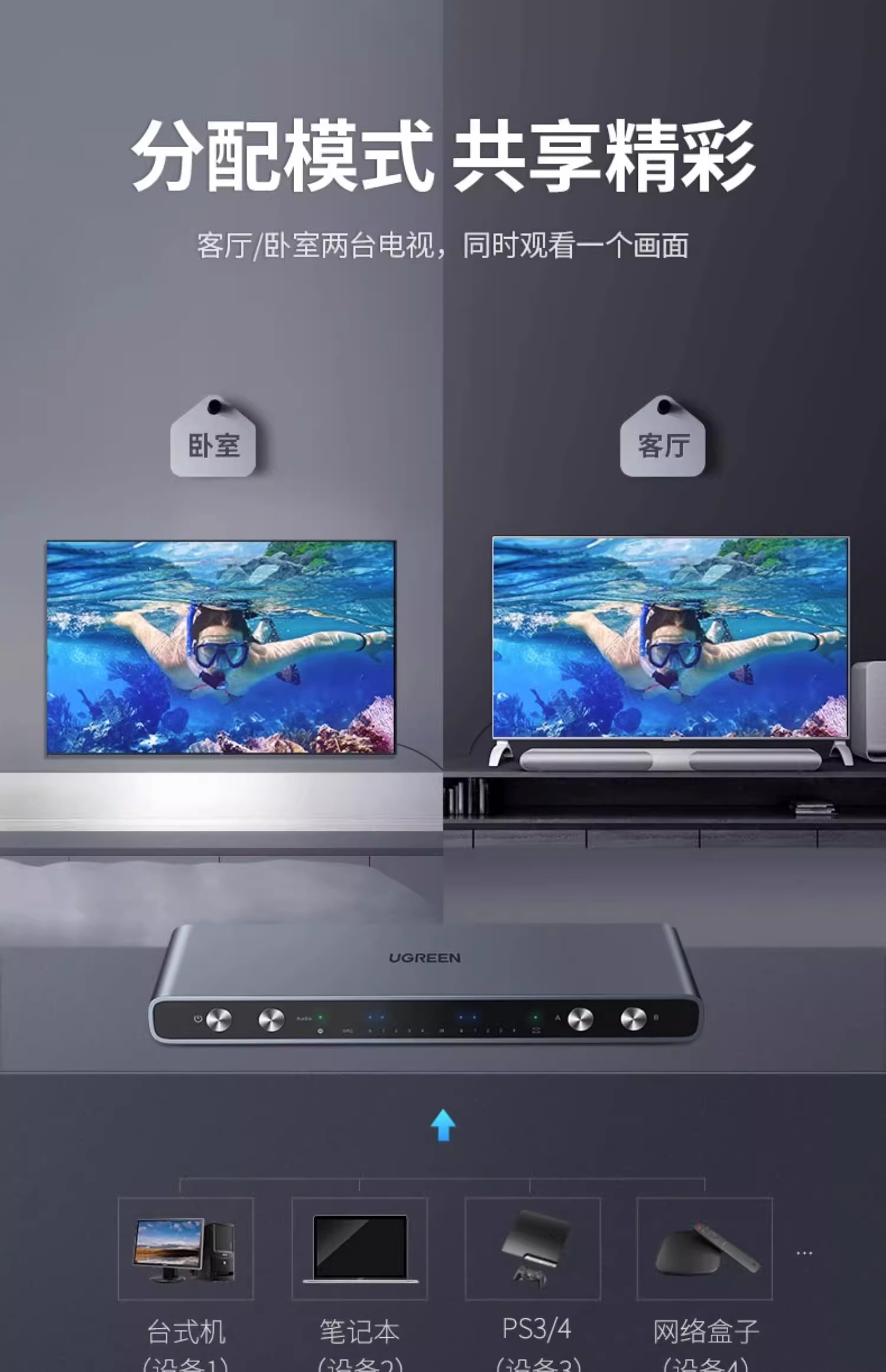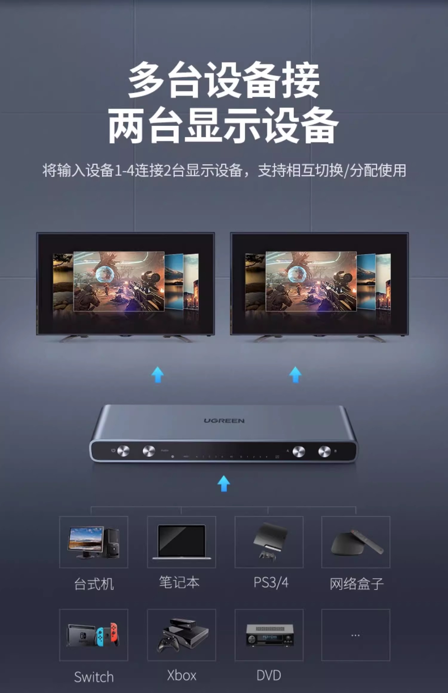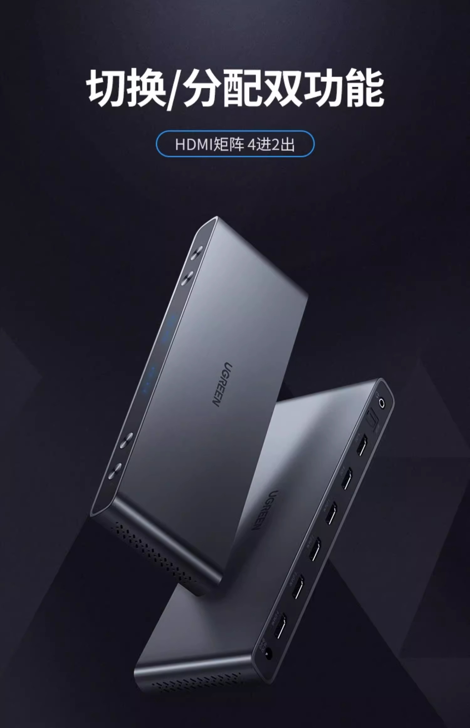 • 绿联 hdmi矩阵四进二出带3.5mm音频光纤4K高清线电脑显示器分离分割分线分屏器4进2出同步共享分配转换切换器