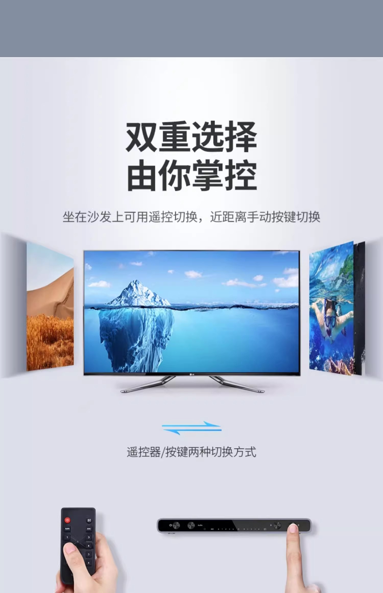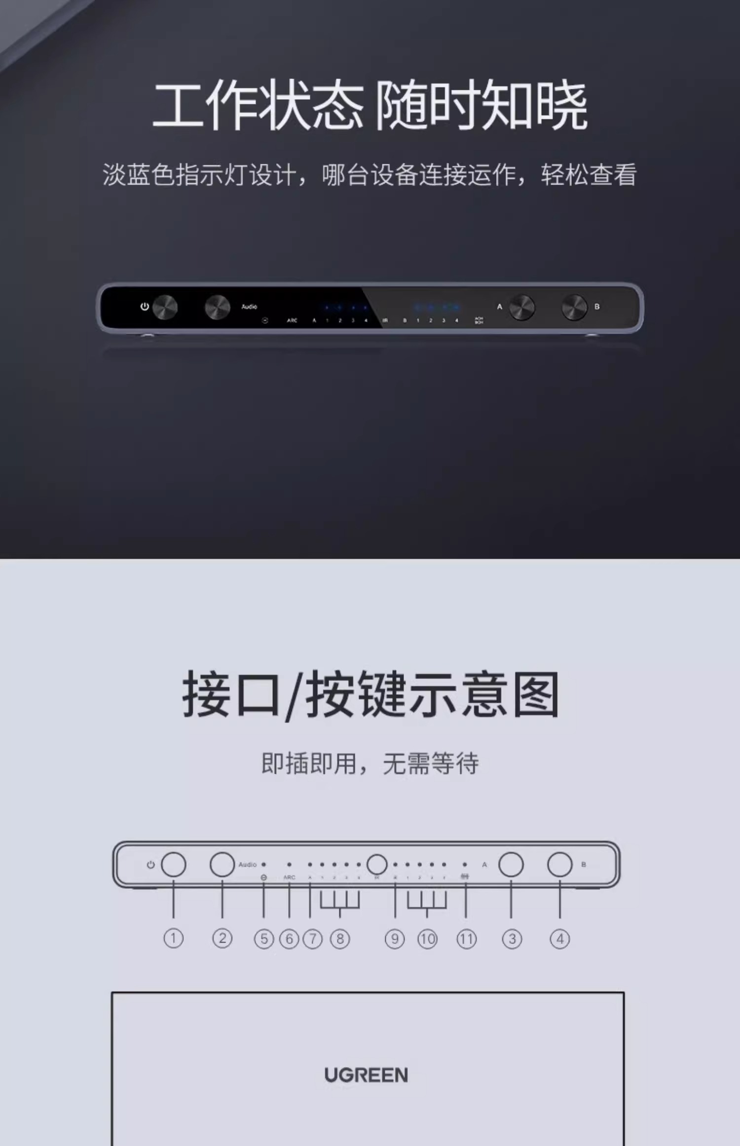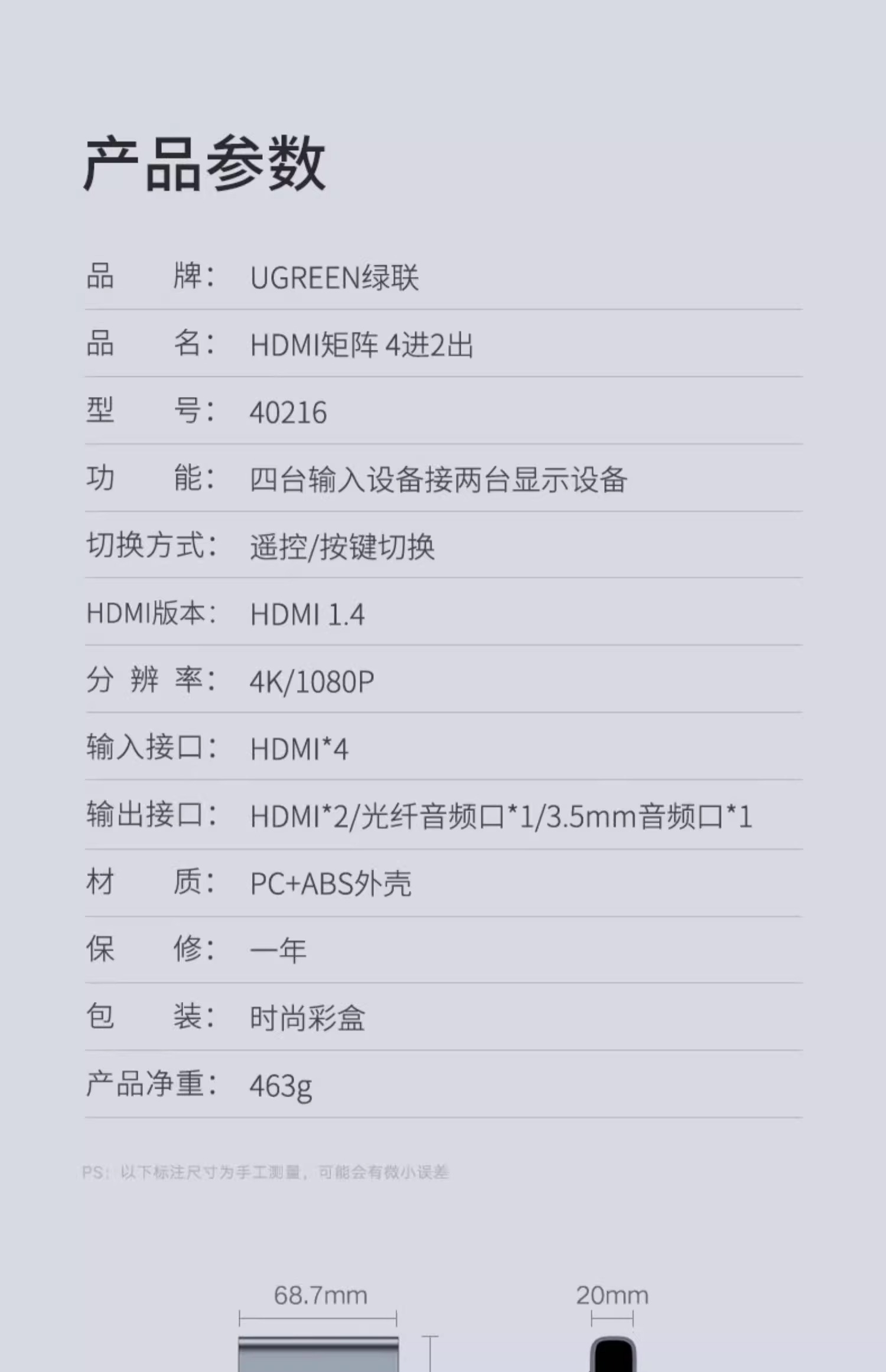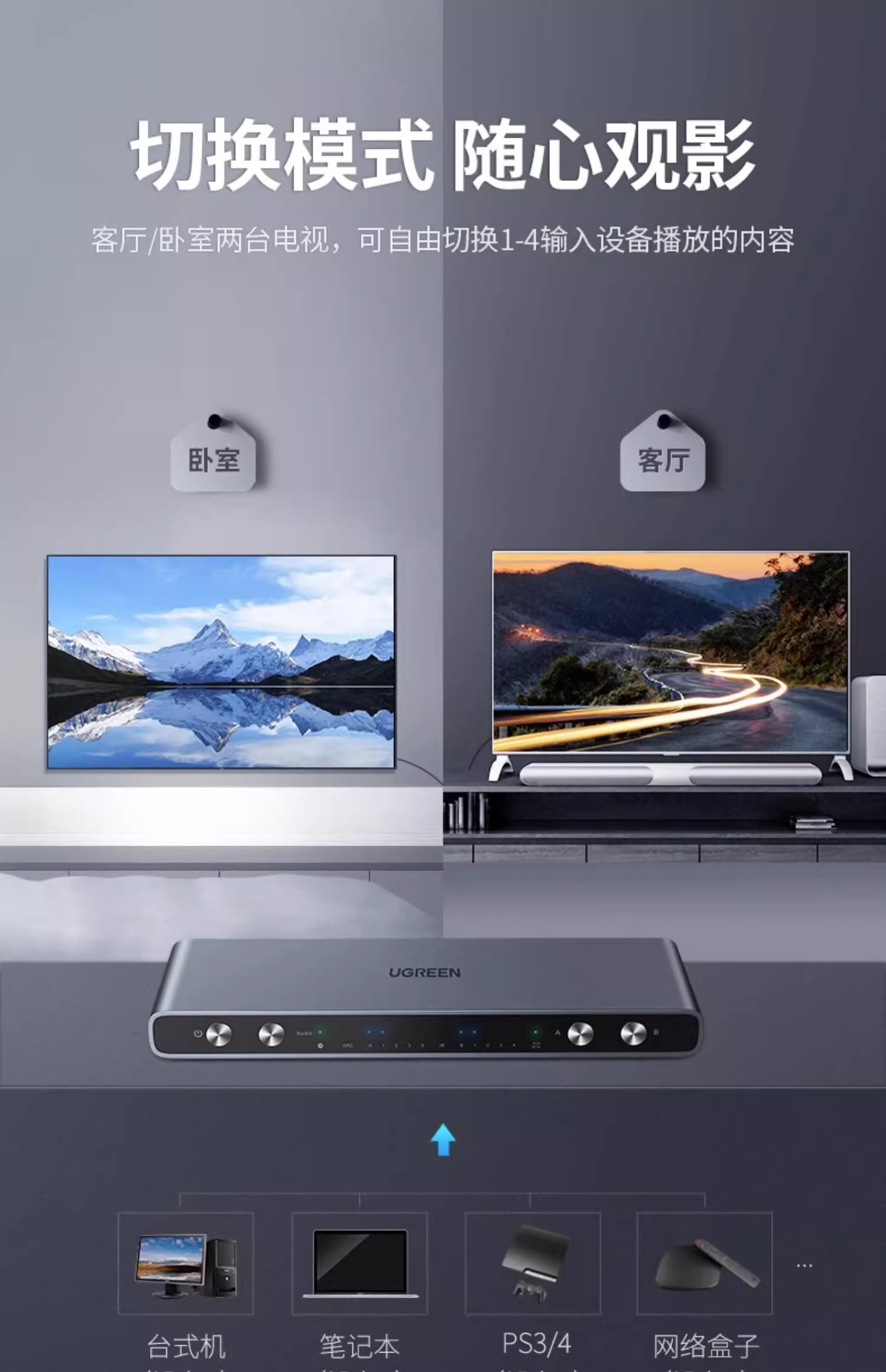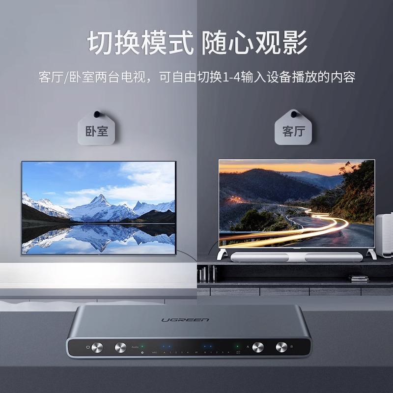 • 绿联 hdmi矩阵四进二出带3.5mm音频光纤4K高清线电脑显示器分离分割分线分屏器4进2出同步共享分配转换切换器